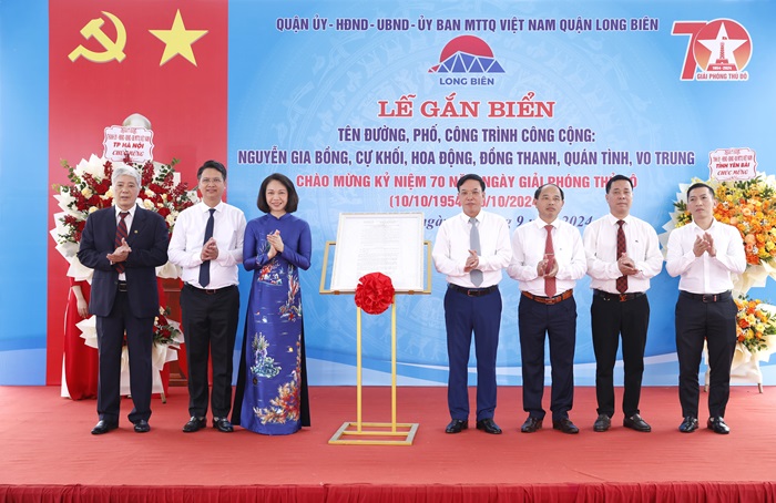 Phát biểu tại buổi Lễ, Phó Chủ tịch UBND quận Long Biên Nguyễn Thị Thanh Hằng cho biết, ngày 31/7/2024, UBND thành phố Hà Nội đã ban hành Quyết định số 3967/QĐ-UBND về việc đặt tên, điều chỉnh độ dài một số đường, phố và công trình công cộng trên địa bàn thành phố Hà Nội năm 2024. Trong đó, quận Long Biên có 6 tuyến đường, phố mới được đặt tên gồm: Cự Khối, Hoa Động, Quán Tình, Đồng Thanh, Vo Trung, Nguyễn Gia Bồng; 01 tuyến phố kéo dài là phố Lệ Mật và 2 công trình công cộng được đặt tên là công viên Long Biên và công viên Ngọc Thụy.