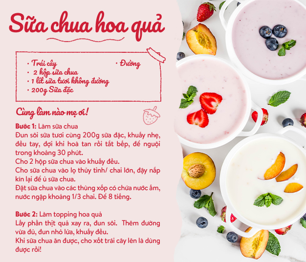 Sữa chua hoa quả là món ăn vặt cho bé cực kỳ tốt. Trong sữa chua có nhiều lợi khuẩn tốt cho hệ tiêu hóa của các bé. Sữa chua kết hợp với hoa quả là một sự kết hợp hoàn hảo cho bữa chiều của bé đấy mẹ ạ! Vừa thơm ngon, bổ, mát, lại thêm vị của trái cây. Ôi, thật là hấp dẫn! Bắt tay vào làm sữa chua cho bé thôi!