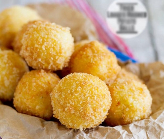 Bước 2: Chia khoai tây ra thành từng phần nhỏ. Ấn dẹt miếng khoai tây, cho 1 ít phomai đã bào vào giữ phần khoai tây nghiền rồi viên tròn lại. Viên khoai tây to bằng nửa quả trứng gà là đẹp 🙂
