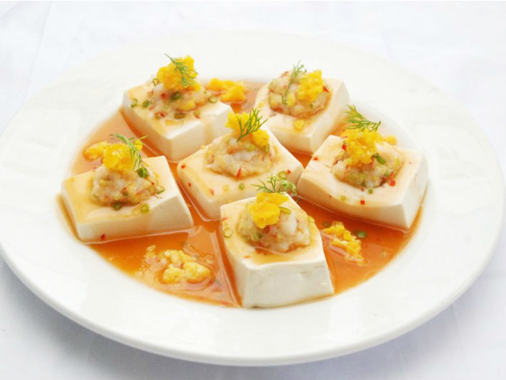 Đậu phụ non cắt hạt lựu cho vào 2 hoặc 3 chén nhỏ.