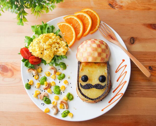 Bạn hãy trang trí món ăn một cách đẹp mắt và sáng tạo với nhiều hình thù lạ mắt. Ví dụ như bạn có thể cắt bánh sandwich thành hình ngôi sao, hình các con thú hay hình trái tim… Hay nếu bé thích ăn mì ống, bạn có thể trang trí thành hình con ốc, hay hình các chữ cái, điều này sẽ làm bé thích thú hơn khi ăn. Còn khi nấu canh, bạn hãy tỉa hoa hay hình những con thú, bé sẽ thích và ăn nhiều rau củ hơn. Ngoài ra, bạn hãy quan tâm đến không khí của bữa ăn, bố mẹ tránh cãi vã, lớn tiếng với nhau bởi sự lộn xộn, xung khắc sẽ làm bé ăn mất ngon.