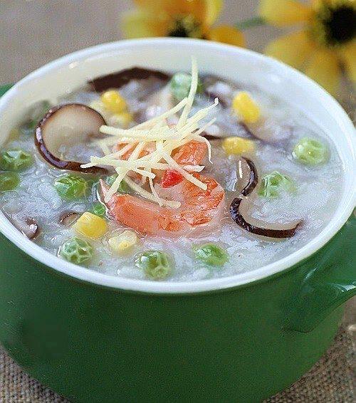 Đợi cháo nhuyễn, rồi cho nấm cùng với tôm vào, đảo đều. Nêm lại thêm 1 lần nữa. Cháo chín, múc ra bát, cho đậu hũ vào và rắc vài cọng hành lá lên trên cho đẹp mắt.