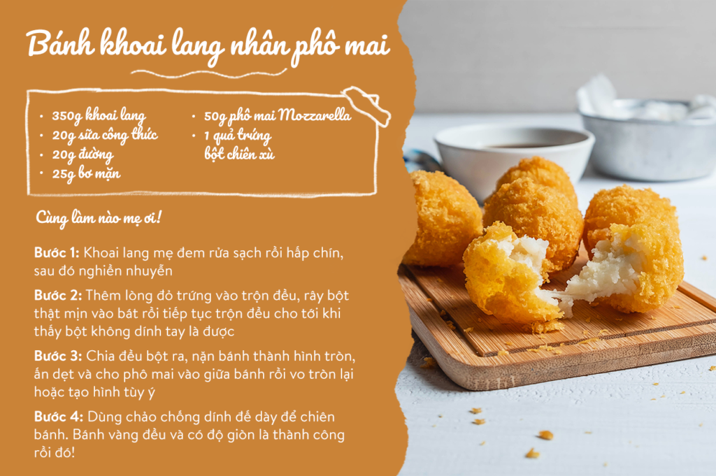 Vị ngọt bùi của khoai lang cùng với vị béo ngậy của phô mai là sự kết hợp hoàn hảo cho bữa ăn vặt của bé. Mẹ hãy bắt tay vào làm ngay thôi!