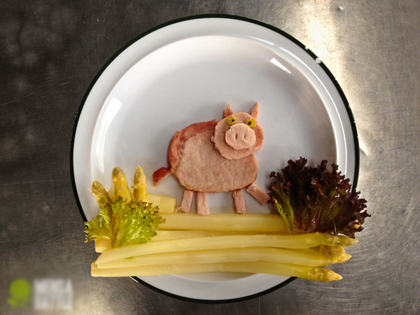 Chú heo làm từ thịt heo bước trên những cây măng tây giòn ngon lại có lợi cho sức khỏe, bé nào mà chối từ chứ.