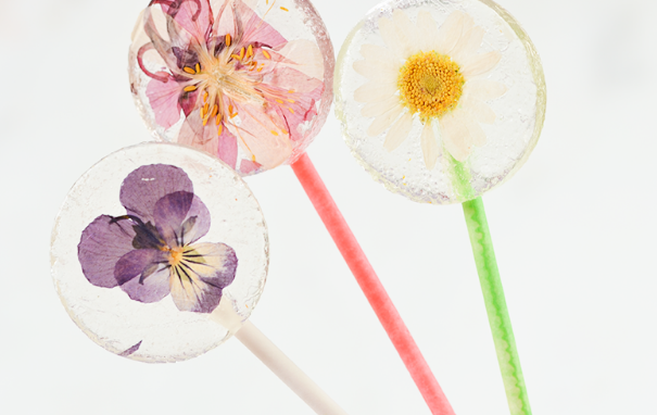 Bạn có thể làm những chiếc kẹo mút với hoa, không những ngon mà còn tuyệt đẹp nữa. Làm những chiếc kẹo nhiều sắc màu cũng được, nhưng kẹo màu trong suốt sẽ làm nổi bật vẻ đẹp tự nhiên của những bông hoa hơn.