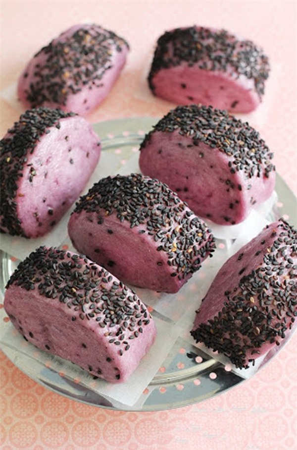 Bánh bao có màu tím tự nhiên nhờ sự kết hợp giữa bột mì và khoai lang tím. Bánh cực kỳ mềm và xốp, thơm nức mùi khoai tím lại được điểm xuyết những hạt vừng đen trông rất thích mắt. Bạn có thể tranh thủ làm bánh bao khoai lang này để cả nhà ăn sáng. Để tiết kiệm thời gian bạn cũng có thể hấp sơ bánh rồi để vào ngăn đá tủ lạnh khi nào thích ăn chỉ vệc hấp lại thôi.