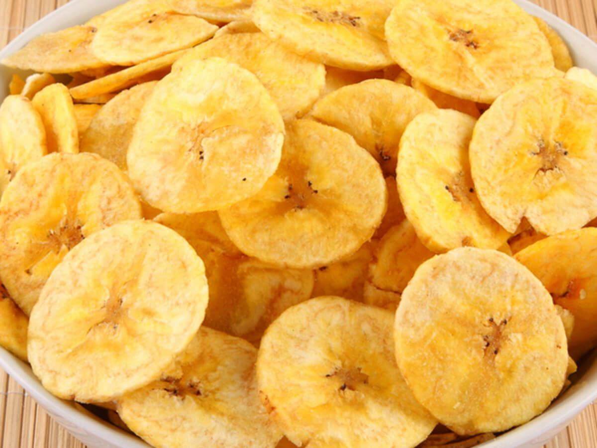Đầu tiên bạn cần cắt lát chuối thật mỏng rồi bỏ dung dịch nước, muối và nghệ rồi ngâm trong nước trong vòng 5 phút. Sau đó rồi để ráo, và cho vào chảo dầu đã nóng, chiên cho đến khi các lát chuối ngả màu vàng đều.