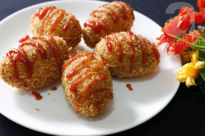 Trong món ăn này bạn hãy để bé giúp nghiền khoai và nặn viên khoai nhé! Bé sẽ thích lắm đấy. Chắc chắn bé sẽ bị mê tít bởi món khoai tây bọc xúc xích chiên xù thơm ngon, đẹp mắt này bởi lớp vỏ ngoài giòn giòn bên trong bột bột, bùi bùi bọc lấy phần xúc xích đậm đà, ngọt thơm, ăn một lại muốn ăn hai đấy.