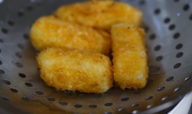 Đổ dầu vào chảo sâu lòng, đun nóng đến 160 độ C. Dùng muôi thủng hoặc rây lọc thực phẩm để chiên cho vụn bánh mì hoặc bột yến mạch không bị rơi ra chảo dầu (vì vụn bánh mì và bột yến mạch rất dễ cháy). Cho 4 - 5 miếng sữa đông vào muôi thủng, nhúng muôi xuống chảo dầu, chiên cho đến khi miếng sữa chuyển màu hơi vàng nâu và giòn.