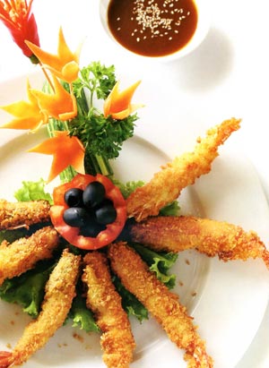 100g tôm sú, 2 cái trứng gà, 200g bột xù, 200g bột mì, 2 thìa cà phê mật ong, 1/2 thìa cà phê muối, 1 thìa cà phê dầu hào, 1 thìa cà phê dầu mè, dầu để chiên, ô-liu đen, xà lách.