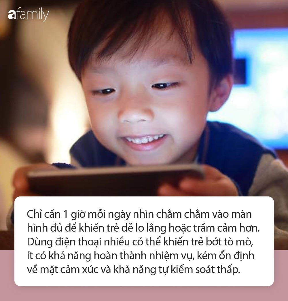 Chỉ cần 1 giờ mỗi ngày nhìn chằm chằm vào màn hình đủ để khiến trẻ dễ lo lắng hoặc trầm cảm hơn. Dùng điện thoại nhiều có thể khiến trẻ bớt tò mò, ít có khả năng hoàn thành nhiệm vụ, kém ổn định về mặt cảm xúc và khả năng tự kiểm soát thấp.