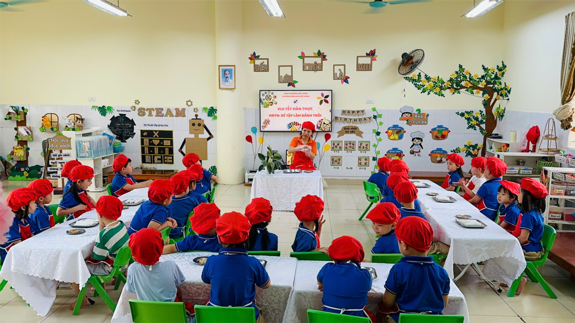 Dưới sự hướng dẫn tận tình của cô giáo, các bé được làm quen với nguyên liệu như bột nếp, đường, vừng... Từng đôi tay nhỏ xinh khéo léo nhào bột, vo tròn và tạo hình những viên bánh đáng yêu. Không khí lớp học trở nên rộn ràng với tiếng cười nói hào hứng của các bé. Bạn nào cũng chăm chú, tỉ mỉ để làm ra những chiếc bánh đẹp nhất. Khi bánh được luộc chín, các bé vô cùng thích thú khi thấy bánh nổi lên mặt nước. Thành quả là những đĩa bánh trôi trắng tròn, dẻo thơm do chính tay các bé làm ra. Hoạt động không chỉ giúp các bé hiểu thêm về ý nghĩa của Tết Hàn Thực mà còn rèn luyện sự khéo léo, kiên nhẫn. Đây cũng là dịp để các bé thêm yêu những nét đẹp văn hóa truyền thống của dân tộc.