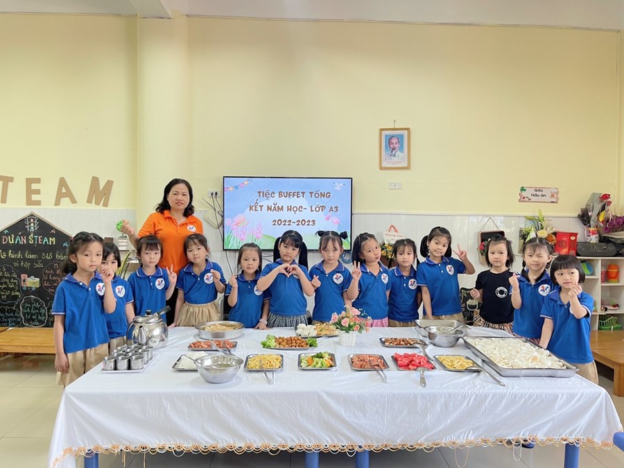 Tiệc Buffet đã trở nên rất quen thuộc và là một nét văn hóa ăn uống mới trong cuộc sống. Nhân dịp kết thúc năm học Lớp mẫu lớn A3 tổ chức tiệc Buffet cho trẻ với mong muốn các con có một bữa tiệc ngon miệng bên cô giáo và các bạn. Đồng thời giúp các con được trải nghiệm thêm các kĩ năng sống cần thiết trong khi ăn uống như: trẻ lựa chọn món ăn theo khẩu vị và ăn lịch sự, từ tốn. Ngoài ra các con còn được giao lưu, trò chuyện với các bạn về món ăn, cách sử dụng đồ dùng để ăn. Qua đó giúp trẻ có thói quen tự phục vụ, mạnh dạn, tự tin trong giao tiếp, ứng xử, tạo tiền đề cho sự phát triển một cách toàn diện.
