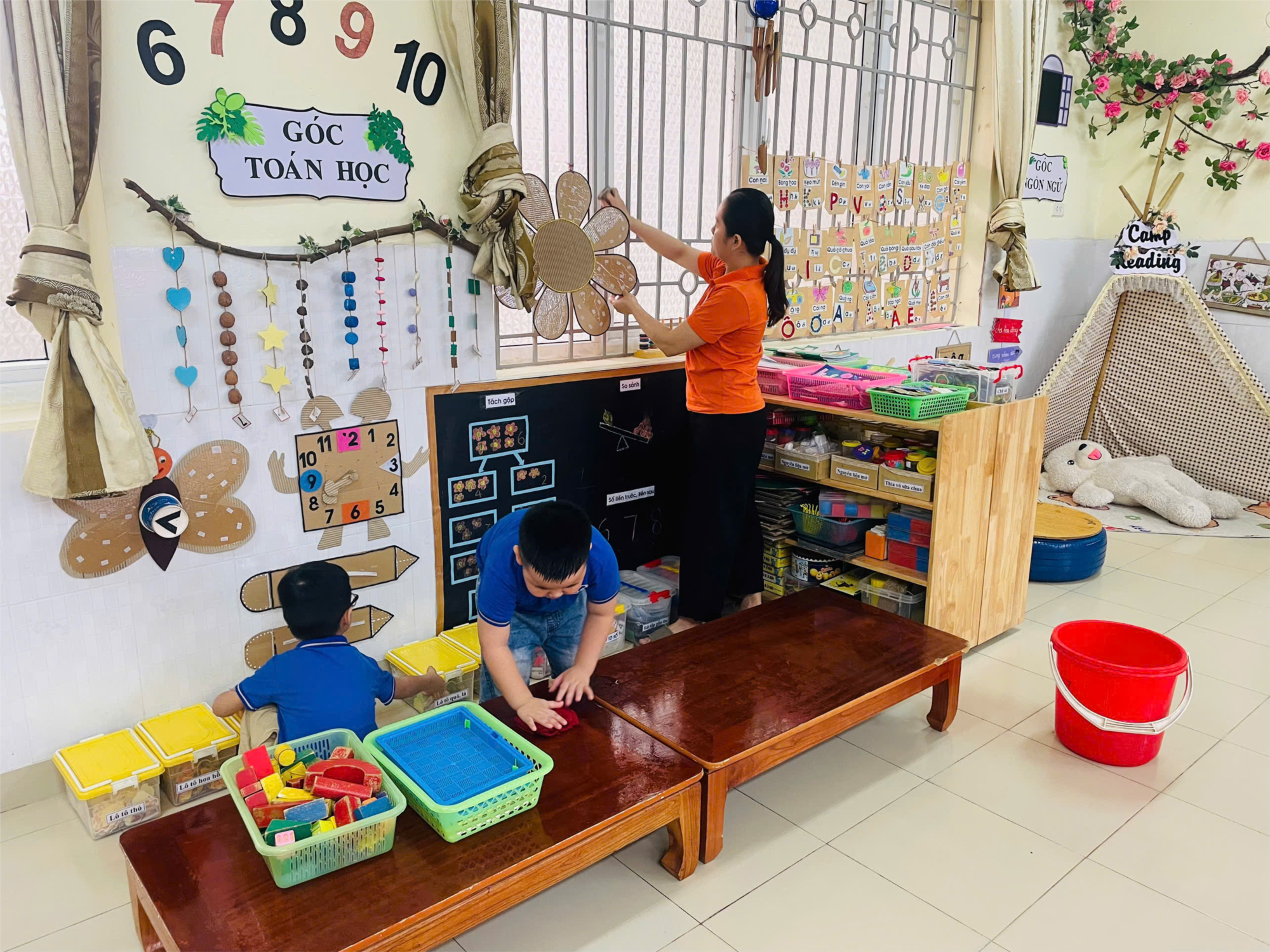Dưới sự hướng dẫn của cô giáo, các bé hào hứng vệ sinh lớp học, giặt xốp, chăn, gối, rửa phơi đồ dùng đồ chơi, quạt, tủ cốc, nhà vệ sinh, lau cửa sổ, lan can... Các khu vực trong lớp được vệ sinh sạch sẽ, đặc biệt chú trọng phòng chống các dịch bệnh theo mùa như tay chân miệng. Hoạt động không chỉ giúp lớp học luôn khang trang, sạch đẹp mà còn giáo dục trẻ ý thức giữ gìn vệ sinh cá nhân, bảo vệ môi trường và phòng tránh dịch bệnh. Thông qua hoạt động ý nghĩa này, các bé thêm yêu lớp, yêu trường và hình thành những thói quen tốt trong sinh hoạt hằng ngày.