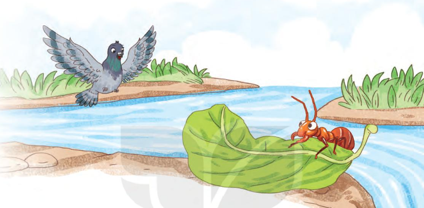 Nghe tiếng kêu cứu của Kiến, Bồ Câu nhanh trí nhặt một chiếc lá thả xuống nước. Kiến bám chặt vào chiếc lá và leo được lên bờ.