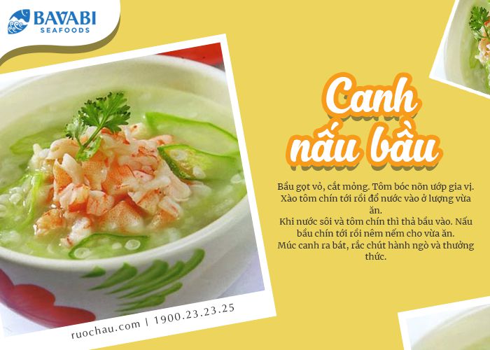 - Khi nước sôi và tôm chín thì thả bầu vào. Nấu bầu chín tới rồi nêm nếm cho vừa ăn.