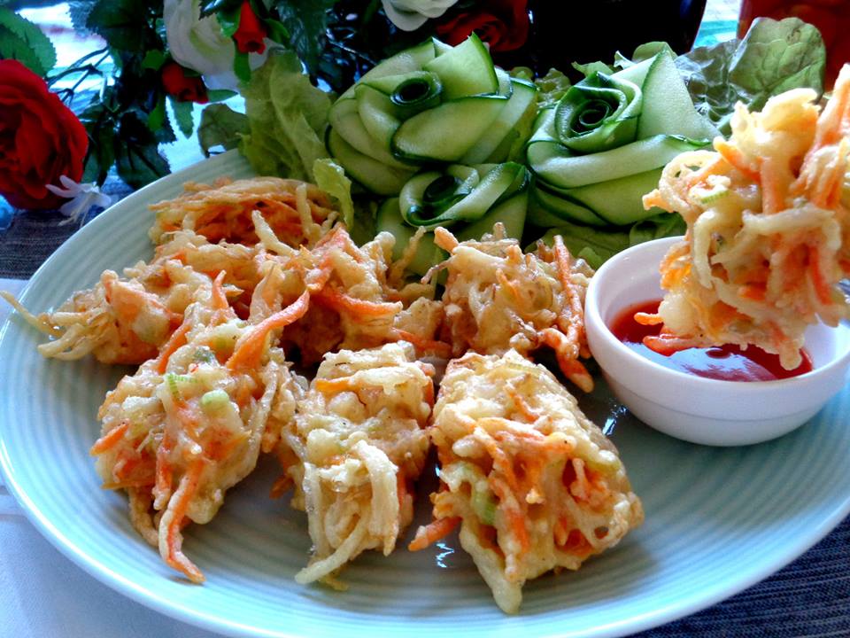 Cho rau củ chiên ra dĩa, trang trí hoa dưa leo và xà lách. Món này ăn nóng chấm với sốt tương ngọt rất ngon.