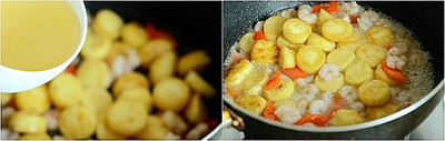 Khi thịt tôm săn lại và ngả màu hồng nhạt thì đổ ớt cắt miếng vào, đảo đều. Thêm đậu hũ vào, cầm cán chảo lắc nhẹ để đảo đậu mà tránh vỡ nát.