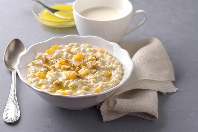 Mẹ có thể cho hạt óc chó vào cháo bí đỏ cho bé, vừa có độ béo vừa giàu dinh dưỡng cho con. Ảnh Internet