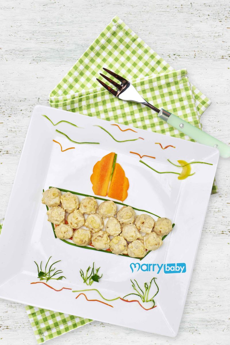 Cà-rốt tỉa buồm. Xếp sò điệp nướng phô mai thành hình thuyền. Trang trí thêm hoa, cỏ, chim trời bằng cà-rốt, dưa leo.