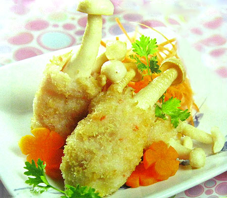 - Nhìn vào món này, bé cứ ngỡ là đùi gà chiên nhưng điều thí vị là bụi nấm nhỏ xinh này được bọc bằng tôm xay, ăn rất ngọt và ngon.